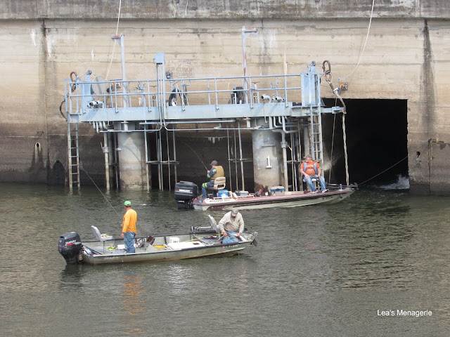 Fishermen in late afternoon sunlight near the Natchez Trace Parkway Bridge across the Tennessee River.